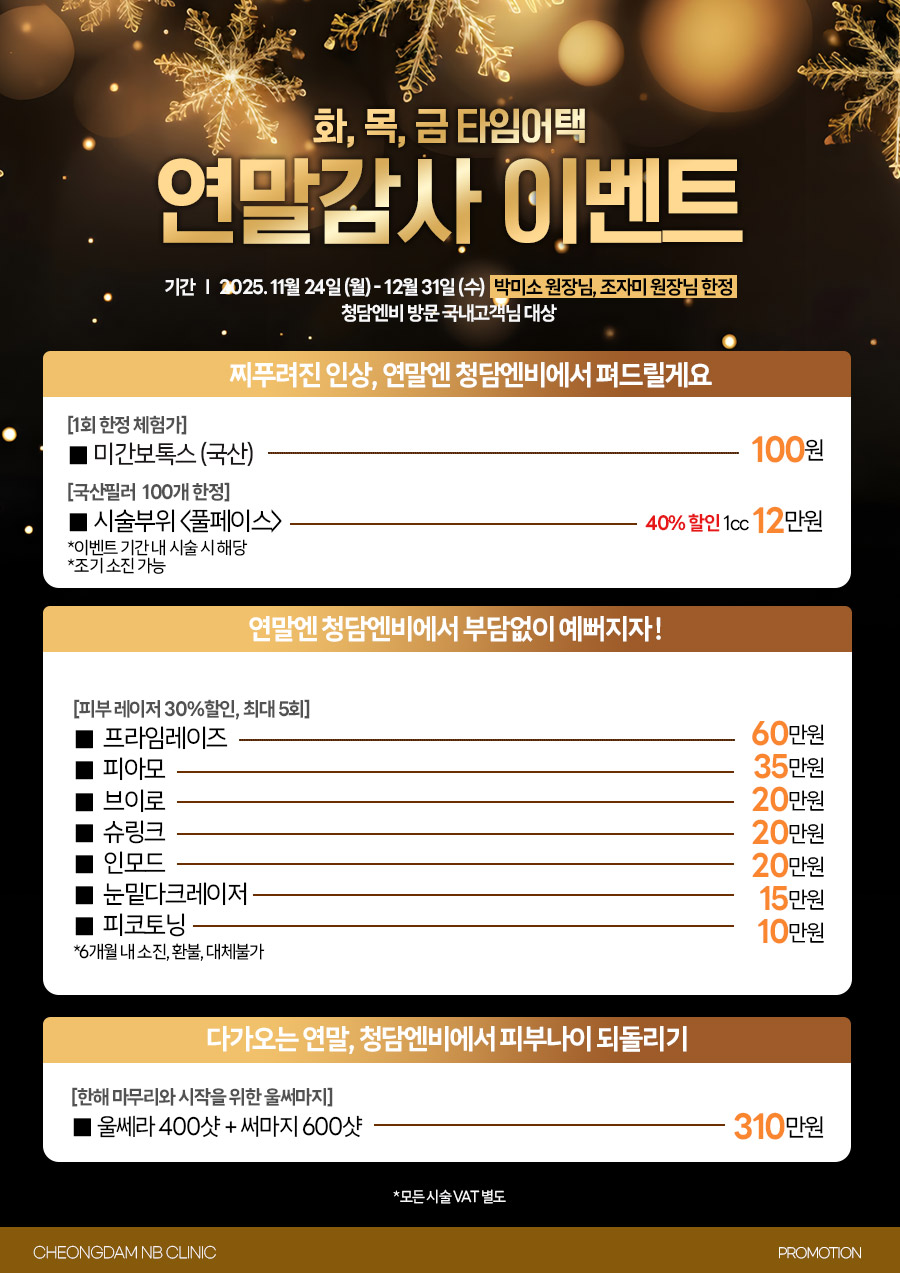 연말 감사 이벤트 2025-11-25 ~ 2025-12-31 본문 ※ 이벤트기간 : 11월 24일 (월) ~ 12월 31일(수) ※ 청담엔비 방문 내국인 고객 대상 ※ 부가세 10% 별도, 현금·카드 동일 ㆍ본 이벤트는 화, 목, 금요일에 진행하는 프로모션입니다. ㆍ박미소원장님, 조자미원장님 프로모션입니다 다음글 목록